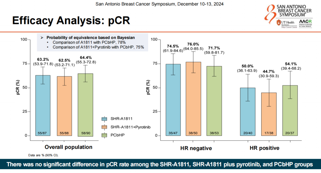 在SHR-A1811的研究中,我们特意筛选了肿瘤负荷较大的患者,以更准确地评估其抗肿瘤活性。结果显示,SHR-A1811单药组的pCR率达到了63%,与标准的四药联合方案相当,这超出了我们的预期。特别是在基线90%淋巴结阳性、70%临床分期为III期的患者中,SHR-A1811表现出了非常显著的治疗效果。