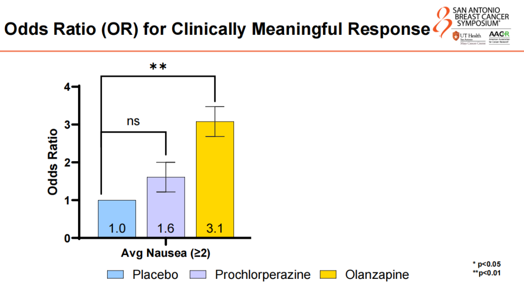 Prof.Luke Peppone:So in terms of safety profile,both of those drugs were excellent,and we had no serious adverse events related to the study intervention drugs,either olanzapine or prochlorperazine.We had a number of adverse events that were all expected.Olanzapine is known to cause sedation and some drowsiness,and those were the typical adverse events that we dealt with,similar with prochlorperazine,but nothing unexpected.And adverse events between the placebo and the study interventions were very similar.We’re still teasing apart those,but the safety profile of those two drugs in our study and in previous research are excellent,and that’s one of the many reasons why they were chosen,and we like using these drugs in these patients.