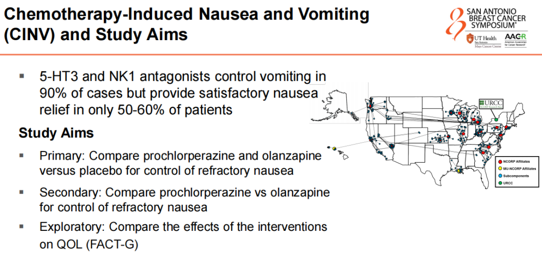 Prof.Luke Peppone:So yeah,a lot of breast cancer patients undergoing chemotherapy will have nausea and vomiting.The drugs that we provide now are excellent at controlling vomiting with over 90%reduction.However,the control of nausea is less than that,around 50%.And that’s because it’s just a harder target for pharmaceuticals to hit,where vomiting is really one center in the brain,nausea is spread to a bunch.So they still have nausea despite a reduction in vomiting,which is quite unpleasant,as you can imagine.So we had two drugs,which were approved in the United States many,many years ago.And we have significant experience with these drugs.So we know their safety profile,they are definitely relatively safe,in terms of pharmaceuticals.And they are relatively cheap for our population and plentiful.They’re available and generic.So it’s very easy to get that.And that was sort of reason why we did this study.