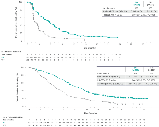 众所周知,SG已在超过40个国家获批用于治疗HR+/HER2-晚期乳腺癌,且在2025年3月获得NMPA批准用于治疗既往接受过内分泌治疗且在转移性疾病阶段接受过至少2种其他系统性治疗的不可切除局部晚期或转移性的激素受体(HR)阳性、人表皮生长因子受体2(HER2)阴性(IHC 0、IHC 1+或IHC 2+/ISH-)乳腺癌成人患者。该适应症批准主要基于TROPiCS-02研究及EVER-132-002研究。