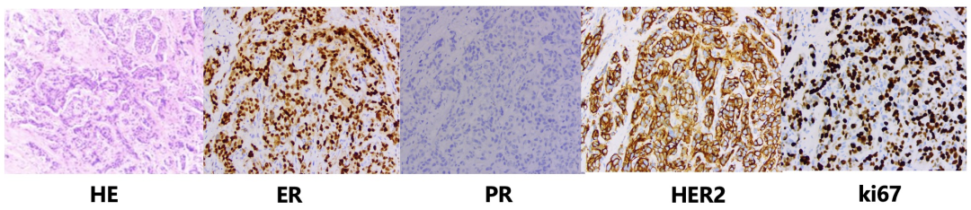乳腺浸润性癌,非特殊类型,III级。IHC:ER约90%强(+)、PR约10%弱-强(+)、HER2(3+)、Ki67约65%(+)。