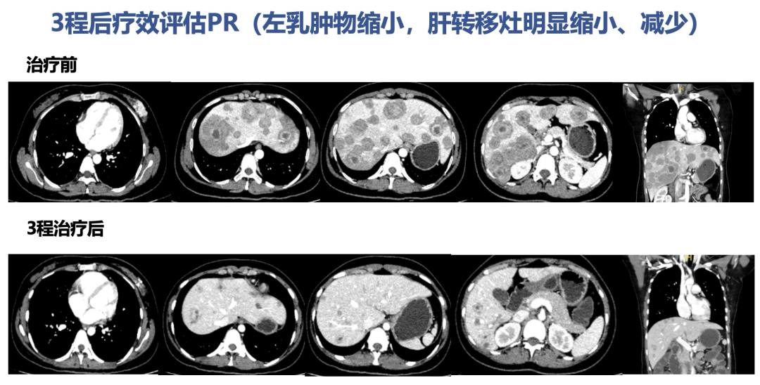 患者于2024-8-22至2024-9-12完成第2、3周期抗肿瘤治疗。3程后疗效评估PR(左乳肿物缩小,肝转移灶明显缩小、减少)