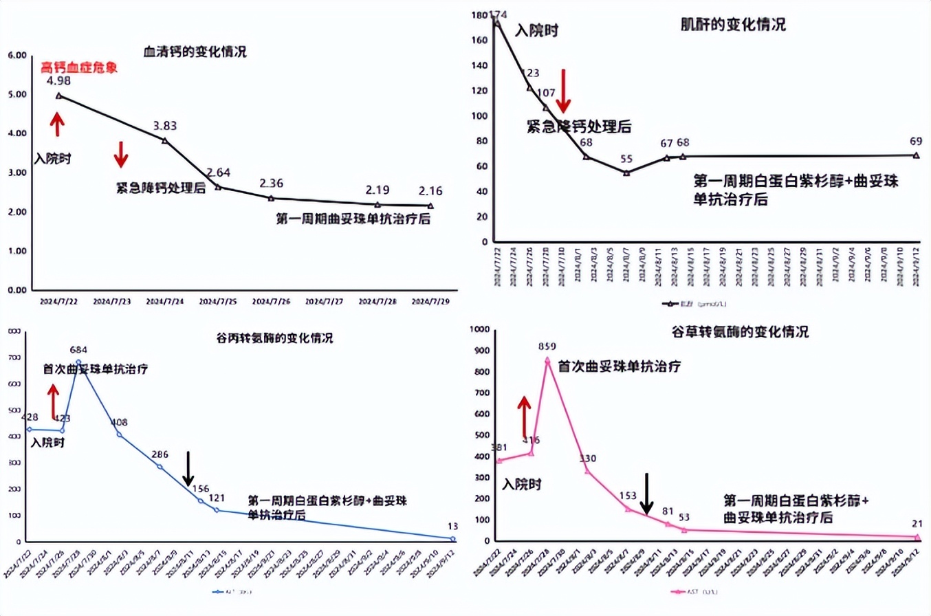 2024年8月7日复查结果显示,患者血钙水平稳定在正常范围内(血钙:2.15 mmol/L),肝功能明显好转(ALT:219 U/L↑,AST:123 U/L↑)。基于此,抗肿瘤治疗方案调整为“小剂量白蛋白紫杉醇(80mg/m2)联合曲妥珠单抗(周疗,2mg/kg)”。完成一个周期治疗后,患者一般情况得到明显改善。