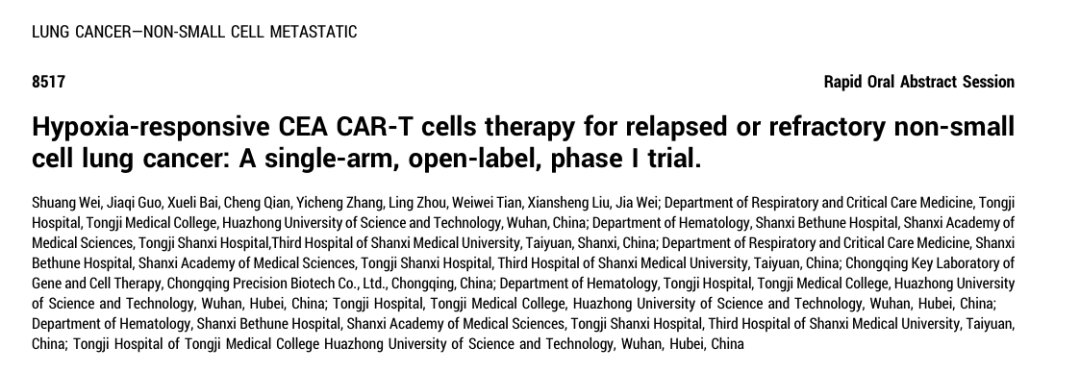 编者按:近日,2025年美国临床肿瘤学会(ASCO)年会于美国芝加哥盛大召开。作为全球临床肿瘤领域最具规模与影响力的学术盛会,ASCO年会汇聚世界顶尖肿瘤学专家,共同聚焦前沿研究与临床难题,推动全球癌症治疗持续进步。在本届大会上,华中科技大学附属同济医院隗佳教授、魏双教授团队与重庆精准生物团队合作开展的低氧响应性癌胚抗原(CEA)靶向CAR-T细胞治疗晚期复发或难治性非小细胞肺癌(NSCLC)I期临床研究(摘要号:8517)入选快速口头报告,该研究旨在验证低氧响应性CEA CAR-T细胞在NSCLC中的应用潜力。《肿瘤瞭望》现场特邀口头汇报讲者华中科技大学附属同济医院周灵博士全面分享研究内容,主要研究者华中科技大学附属同济医院隗佳教授及魏双教授进行深度点评,以期为CAR-T细胞疗法在肺癌领域中的优化及应用提供全新视角。