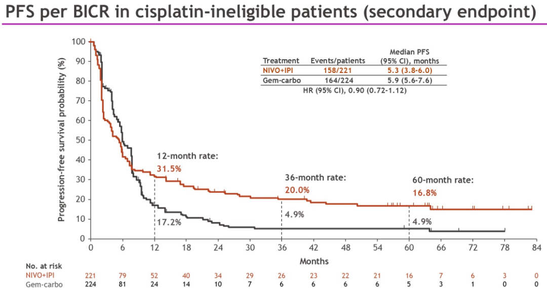 CheckMate-901的早期结果表明,对于肿瘤细胞表达PD-L1≥1%的患者,与吉西他滨联合铂类化疗相比,纳武利尤单抗联合伊匹木单抗并未改善OS(HR 0.87;P=0.364;P值界值为0.0252)。在van der Heijden报告的一组不适合顺铂治疗的患者中,OS的HR为0.79(P=0.0245;P值界值为0.0173),中位随访时间为69个月。