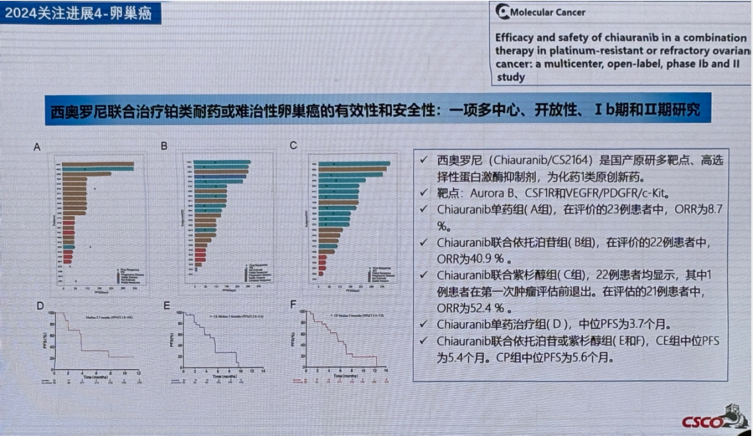 铂耐药或难治性卵巢癌是一种高度致命的妇科疾病,治疗选择有限。Chiauranib是一种新型小分子选择性抑制剂,可有效靶向包括Aurora B、CSF-1R等多个通路,抑制细胞周期进程、改善抗肿瘤免疫功能,同时靶向血管内皮生长因子(VEGF)通路以抑制肿瘤生长。