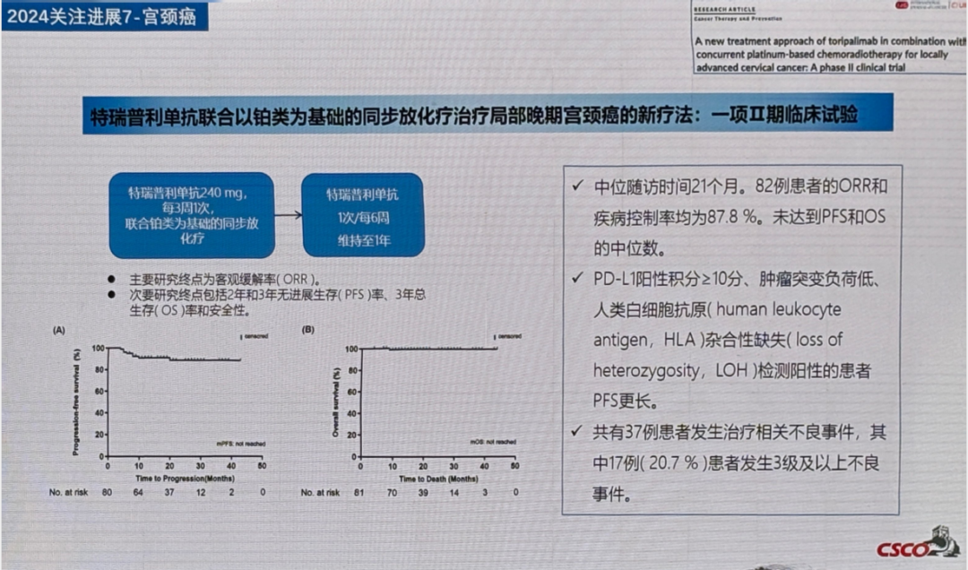 天津医科大学肿瘤医院陈杰、袁智勇教授团队的这项II期研究(n=82)显示,特瑞普利单抗(PD-1抑制剂)联合同步铂类放化疗在初治局部晚期宫颈癌(LACC)患者中具有良好的抗肿瘤疗效(ORR和疾病控制率均为87.8%,中位PFS和OS均未达到)和可控的安全性。其中,在PD-L1 CPS≥10、低肿瘤突变负荷(TMB)及存在人类白细胞抗原杂合性缺失(HLA-LOH)的患者中亦观察到PFS延长趋势。