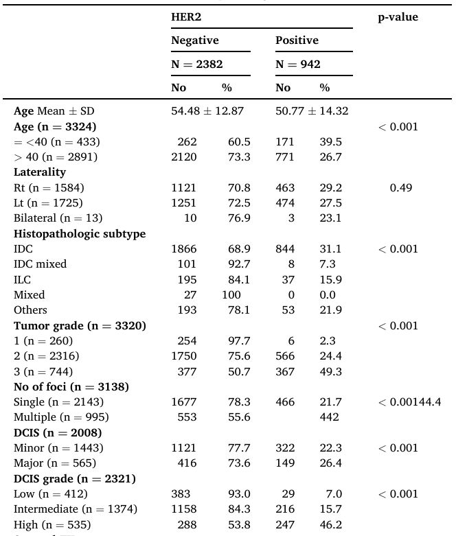 HER2阳性与一系列可识别的临床病理特征显著相关:年龄<40岁、浸润性肿瘤级别较高、存在多个肿瘤病灶、肿瘤主要成分为DCIS且包含高级DCIS成分的患者,HER2阳性的可能性显著升高(P<0.001)。
