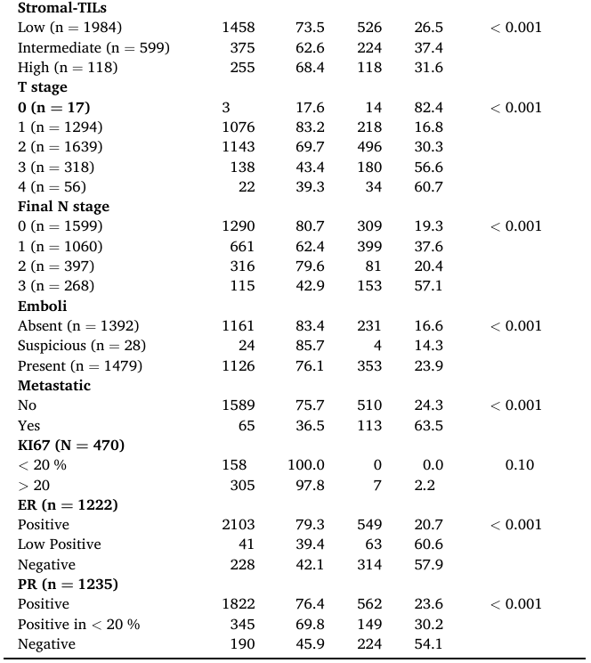 通过回顾患者基线时的放射学检查结果,并将其与化疗后乳房切除术瘤床和淋巴结状态进行比较,评估了患者的初始肿瘤大小和淋巴结状态。ER、PR、HER2和SISH相关数据已根据指南进行审查和报告。ER阳性率为1%-10%的浸润性癌症被报告为ER低阳性。根据IHC观察到的阳性率,PR状态分为两组:1%-20%和超过20%。