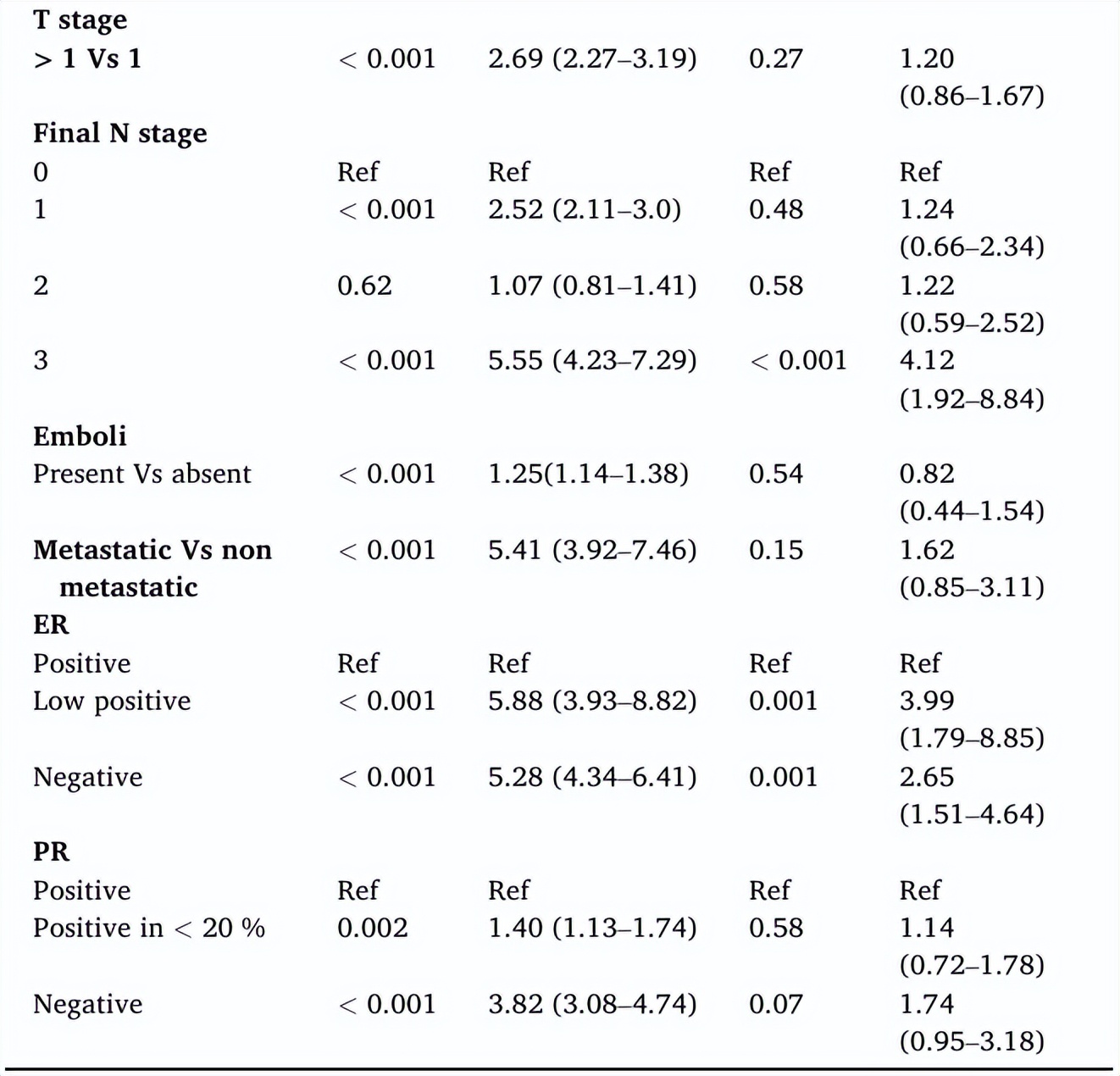 肿瘤分期较高(T3和T4)、初诊时仅有淋巴结转移(T0)以及淋巴结转移数量增多,与HER2阳性状态呈显著相关性(P<0.001)。此外,转移性疾病和瘤栓的存在也与HER2阳性相关(P<0.001)。