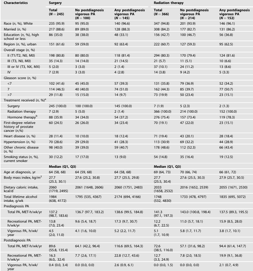 ▽2002-2014年前列腺癌队列研究的患者特征(按诊断后体力活动和主要治疗进行分组)