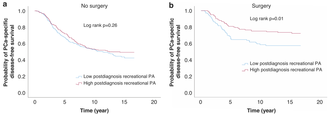 综上所述,确诊后进行体力活动,尤其是剧烈体力活动,与接受手术而非放射治疗的前列腺癌患者的预后改善相关。该结论需要进一步的临床研究和观察性研究来证实这一发现,并分析可能的机制和解释。