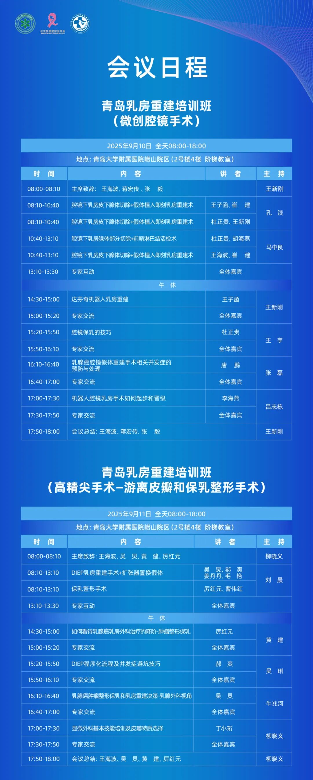 9月11日(周四)青岛乳房重建培训班的日程则围绕“高精尖手术-游离皮瓣和保乳整形手术”展开,由复旦大学附属肿瘤医院吴炅教授、重庆医科大学第一附属医院厉红元教授带领团队进行现场实操与学术分享,这种结合临床需求的外科学习班将极大推动区域乳腺外科技术的进步。