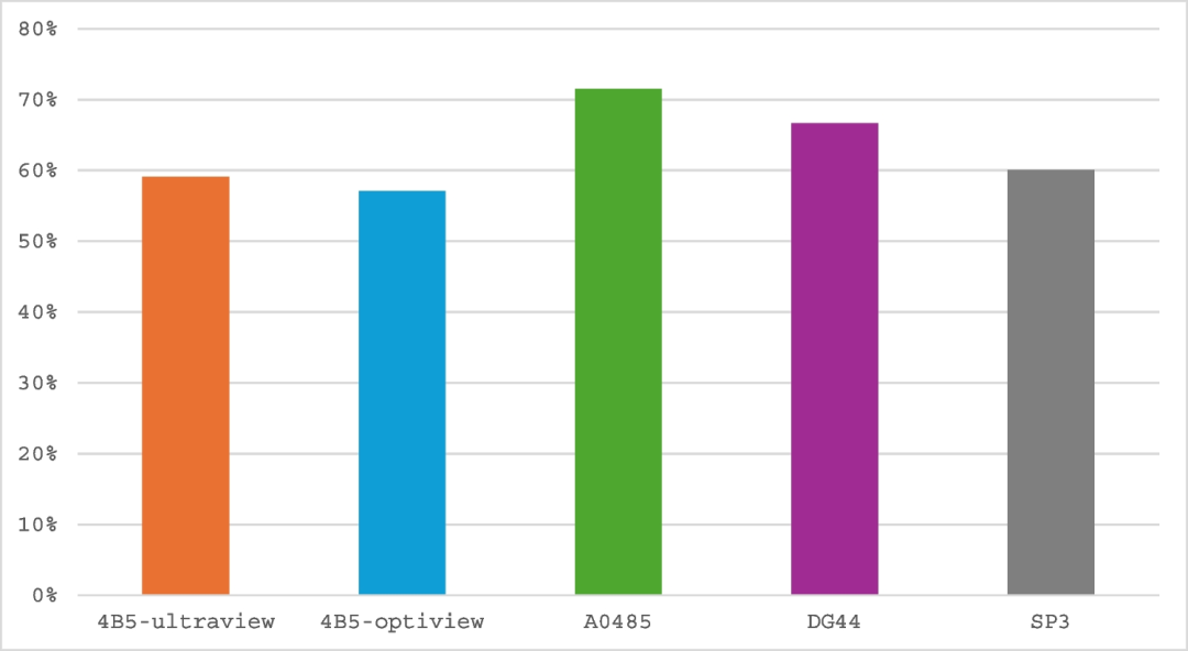 目前,使用最多的HER2抗体是4B5(21家实验室;60%),其次是DG44(7家实验室;20%)、A0485(4家实验室;15%)和SP3(2家实验室;5%)。在使用4B5的实验室中,17家使用Ultraview检测试剂盒,4家使用Optiview检测试剂盒。多年来,共有7家实验室更换了克隆。其中3家实验室从A0485更换为DG44,2家实验室从SP3更换为DG44,1家实验室从SP3更换为4B5-Optiview,1家实验室从CB11克隆(BOND Oracle HER2 IHC检测试剂盒)更换为DG44。