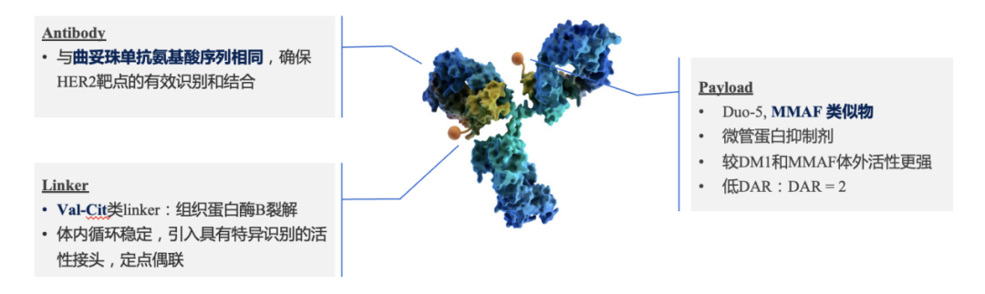 博度曲妥珠单抗则通过药物结构设计上的独具匠心,以独特优势实现“差异化竞争”:其搭载的药物载荷为新型MMAF类似物——高细胞毒性微管蛋白抑制剂Duo-5,作用机制不同于T-DXd所使用的拓扑异构酶Ⅰ,创新连接子也使博度曲妥珠单抗的药物-抗体比(DAR)均一稳定。