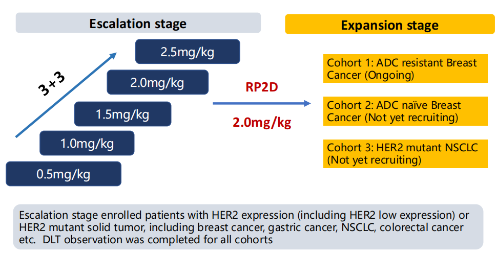 第一阶段研究采用“3+3”剂量递增设计,剂量水平为0.5、1.0、1.5、2.0至2.5 mg/kg,每3周一次(Q3W)。研究入组了HER2表达或突变的局部晚期或转移性实体瘤患者,这些患者既往标准治疗耐药或不耐受。主要研究终点为安全性、剂量限制性毒性(DLT)和推荐II期剂量(RP2D);次要终点包括疗效和药代动力学(PK)。