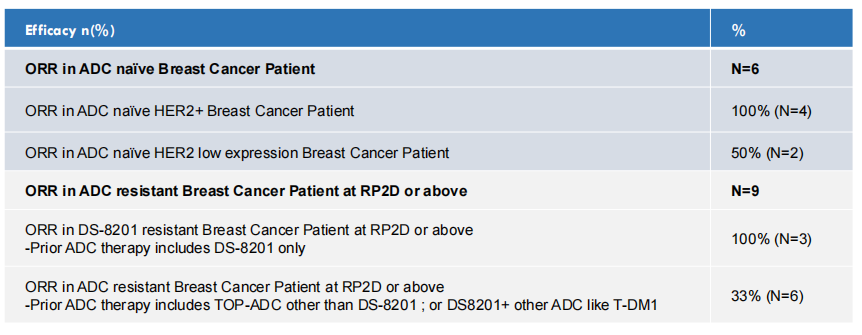 对28例患者进行了疗效评估。在未接受过ADC治疗的HER2阳性乳腺癌患者中,客观缓解率(ORR)达到100%(4例)。对于ADC经治的患者:在RP2D及更高剂量水平,既往接受过DS-8201治疗的乳腺癌患者ORR为100%(3例);而既往接受过非DS-8201 ADC或同时包含TOP1抑制剂ADC和微管蛋白抑制剂ADC等多种ADC治疗的患者,ORR为33%,疾病控制率(DCR)达到100%。在HER2高表达和低表达的ADC经治乳腺癌患者中均观察到了强劲的抗肿瘤活性。