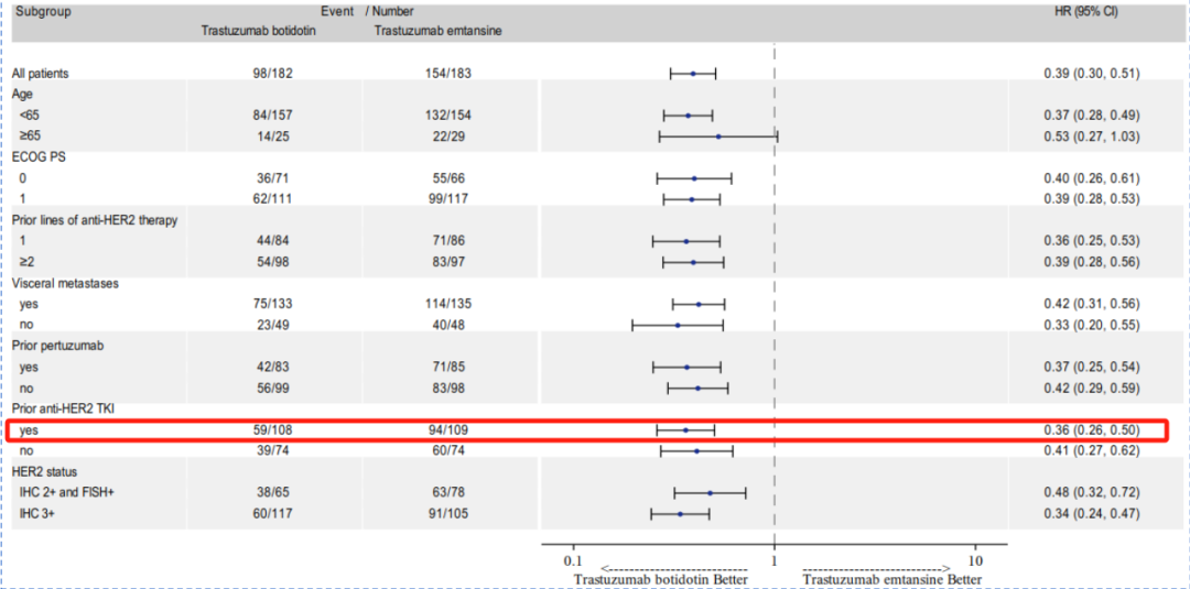 胡夕春教授:在HER2阳性乳腺癌的治疗策略上,中国与国外存在一定差异。国外患者在二线治疗阶段较少使用TKI,而在中国临床实践中,TKI的应用比例较高。在本项研究的入组人群中,约有60%的患者曾接受过TKI治疗,另有约45%的患者使用过帕妥珠单抗治疗。在此背景下,本研究依然获得了阳性结果,尤为值得关注。对于既往接受TKI治疗的中国HER2阳性乳腺癌患者,A166表现出显著优于T-DM1的疗效,显示出与总结人群一致的PFS获益趋势[HR 0.36,95%CI(0.26,0.50)]。