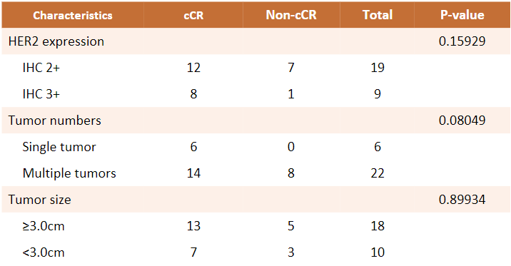我们的研究数据显示,经维迪西妥单抗联合替雷利珠单抗治疗后,以utDNA定义的cCR率为71.4%,HER2 IHC 2+或3+、肿瘤单发与多发、肿瘤直径≥3.0cm或<3.0cm患者的cCR率均无显著差异。治疗4个周期后,HER2 IHC 3+患者utDNA定义的cCR率高达88.9%(8/9),单发肿瘤患者的utDNA定义的cCR率为100%。
