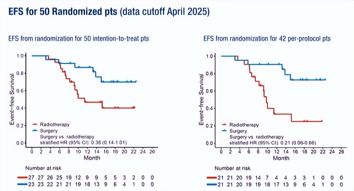 ☆在意向性治疗人群(n=50)中,手术组相较于放疗组显示出EFS的改善趋势,风险比HR=0.38。