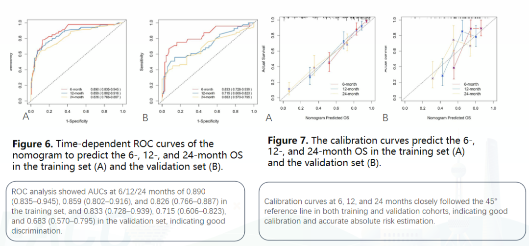 图3.模型在训练队列和验证集中对患者OS的预测效能