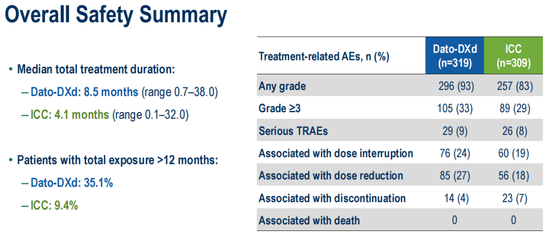 同时,Dato-DXd也在TB-02研究中表现出良好的治疗安全性,尽管Dato-DXd组的治疗持续时间为ICC组的2倍以上,但两组≥3级治疗相关不良事件(TRAE)和严重TRAEs发生率基本相似(≥3级TRAEs:33%vs 29%,严重TRAE:9%vs 8%),且Dato-DXd治疗相关的≥3级中性粒细胞减少发生率较低(<1%vs 4%),也未报告TRAE导致的患者死亡。