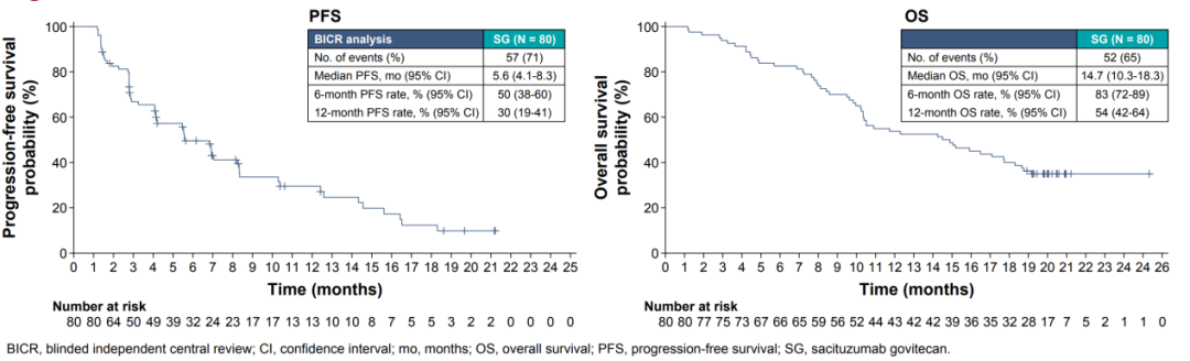 在我国的徐兵河院士领衔的EVER-132-001研究中,纳入了我国80例经过≥2种标准治疗方案后进展的、无脑转移的局部晚期或转移性TNBC患者,结果显示戈沙妥珠单抗的mPFS为5.6个月,mOS为14.7个月,与ASCENT研究表现一致[14]