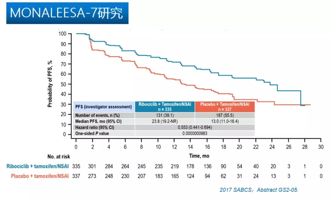 MONALEESA-7研究是一项随机、双盲、安慰剂对照的Ⅲ期临床研究,旨在评估既往未接受内分泌治疗的HR+/HER2-晚期乳腺癌绝经前或围绝经期女性中,Ribociclib与TAM或一种AI和LHRH类似物联合治疗的有效性和安全性;共随机纳入670多名23-58岁的女性患者。2017 SABCS大会上,该研究同样以late-breaker报告了首次分析数据,Ribociclib联合AI可增加 14个月的PFS(联合方案对比AI单药的PFS:27.5 vs. 13.8个月),达到主要研究终点。第一次中期分析的出色结果令人对此次ASCO大会上公布的OS结果充满信心和期待。