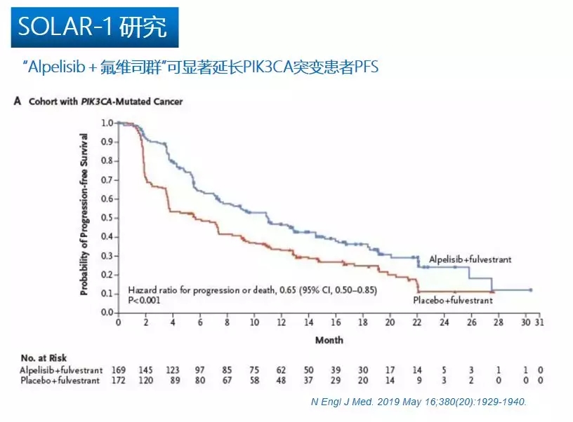 SOLAR-1研究是一项国际多中心、随机双盲、安慰剂对照的Ⅲ期研究,于2015年7月26日~2017年7月21日从34个国家地区198个研究中心入组HR+/HER2-晚期乳腺癌AI治疗失败患者572例,按1:1随机分组接受Alpelisib+氟维司群或安慰剂+氟维司群。2019 ASCO大会前夕,该研究已发表于NEJM,证实Alpelisib+氟维司群可显著延长PIK3CA突变患者PFS(11.0 vs. 20个月;HR 0.65;95%Cl,0.50-0.85,P<0.001),达到了主要研究终点。