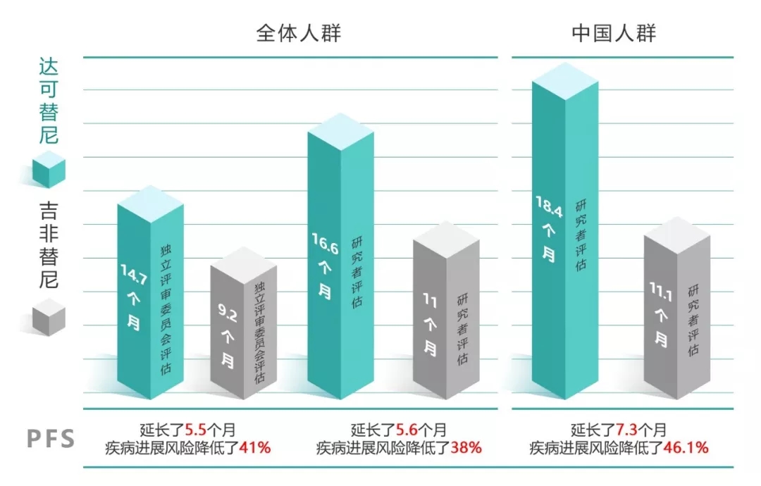 与吉非替尼相比,多泽润?显著提高无进展生存期(PFS),疾病进展风险下降46%。全体人群中,研究者评估多泽润®组的中位PFS达16.6个月(吉非替尼组11.0),独立评审委员会评估为 14.7个月(吉非替尼组9.2个月);在中国人群中疗效更佳,PFS达18.4个月,较吉非替尼延长了7.3个月(吉非替尼组11.1)。