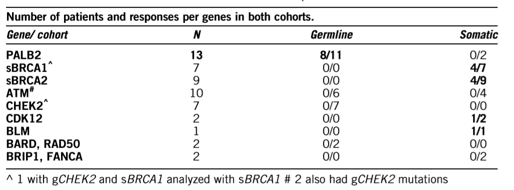 本研究对DDR通路不同基因突变的转移性乳腺癌使用奥拉帕利单药进行了探索,研究入组54例患者,队列1包括非BRCA1/2的胚系DDR通路基因突变,队列2包括体系DDR通路基因突变或BRCA1/2突变,患者均接受奥拉帕利单药治疗直至进展或不耐受。结果显示队列1 ORR为29.6%,队列2为38.5%。不同的突变基因中gPALB2和sBRCA突变可预测反应,仅CHEK2和ATM突变未见应答。具体突变基因响应如下: