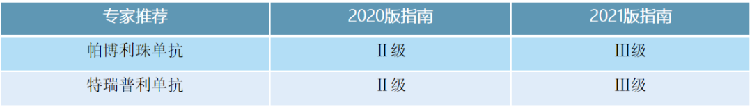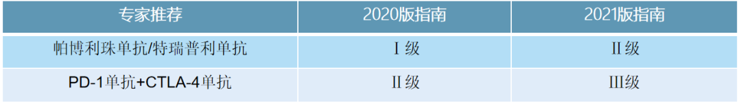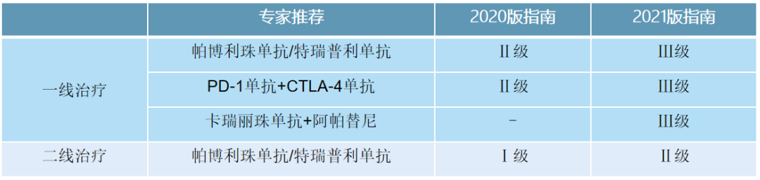 在转移性或不可切除患者中,国内有关免疫治疗的证据主要在二线治疗,且上述回顾性研究提示中外患者的疗效差异。因此,新版指南中单免方案帕博利珠单抗、特瑞普利单抗一线治疗的推荐级别由Ⅰ级调整为Ⅱ级,纳武利尤单抗调整为Ⅲ级;而PD-1+CTLA-4双免方案由Ⅱ级调整为Ⅲ级。