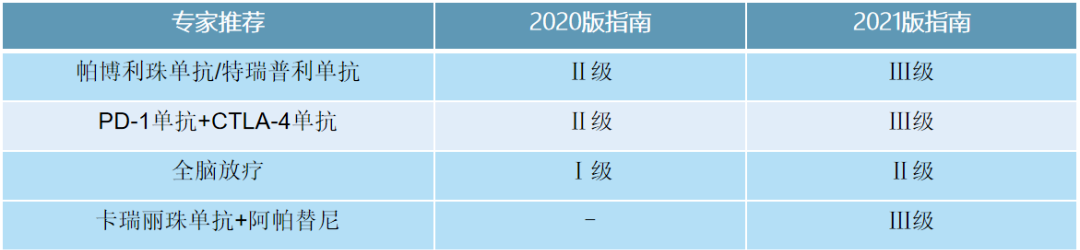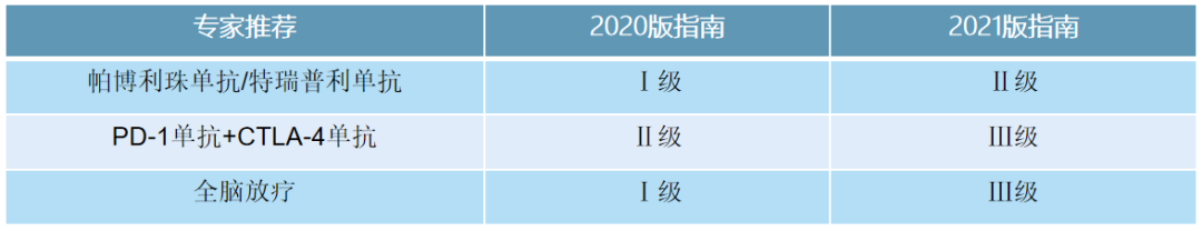 同样,对于存在脑转移播散性(不可切除)Ⅳ期患者,新版指南将帕博利珠单抗、特瑞普利单抗解救治疗的推荐级别由Ⅰ级调整为Ⅱ级,PD-1+CTLA-4双免方案由Ⅱ级调整为Ⅲ级。