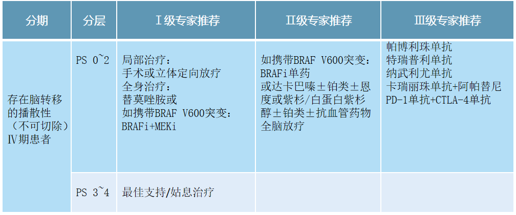 对于存在脑转移的播散性(不可切除)Ⅳ期肢端型黑色素瘤患者,新版指南同样将PD-1/L1单免方案及PD-1+CTLA-4双免方案由Ⅱ级调整为Ⅲ级,并在Ⅲ级推荐中增加了卡瑞丽珠单抗+阿帕替尼,而全脑放疗则由Ⅰ级调整为Ⅱ级。