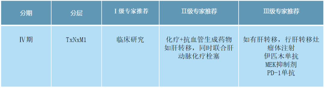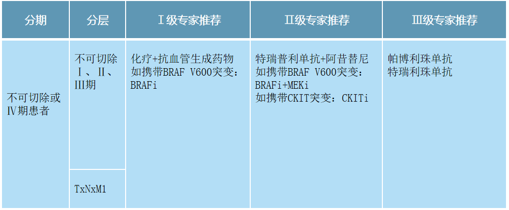 晚期眼部黑色素瘤的治疗推荐整体上没有太大变化。此型肿瘤的突变率低,易肝转移,且免疫治疗不敏感,化疗+刚血管生存药±TACE 仍为重要选择。此外,新版指南也再次强调了肝转移灶瘤体注射对黑色素瘤肝转移治疗可能成为新的研究热点。