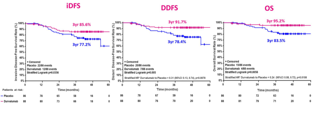pCR组和非pCR组的3年iDFS分别为92.0%和71.9%(log-rank p=0.002)。Durvalumab组3年iDFS为85.6%,安慰剂组为77.2%(HR=0.31,95%CI:0.13~0.74,P=0.0398);3年DDFS 91.7% vs 78.4%(HR=0.37,95%CI:0.13~0.74,P=0.0078);3年总生存率95.2% vs 83.5%(HR=0.24,95%CI:0.08~0.72,p=0.0108)。实验组及对照组的iDFS、DDFS和OS无差异。