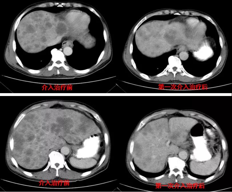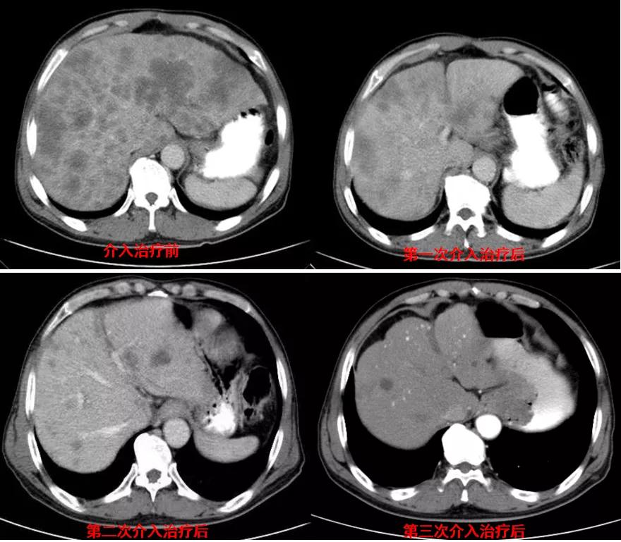 讨论:患者病灶进一步减小,病情控制好,治疗疗效显著且肝转移病灶大于3个,因此不建议行射频消融治疗,建议继续行介入联合靶向治疗。