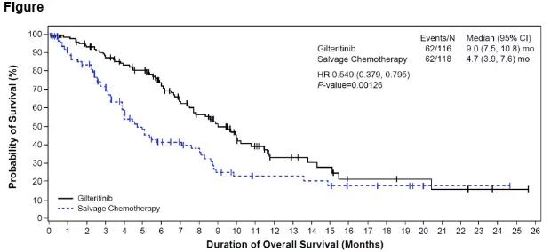 图4: FLT3抑制剂吉瑞替尼(gilteritinib)延长福莱特突变R/R-AML患者生存