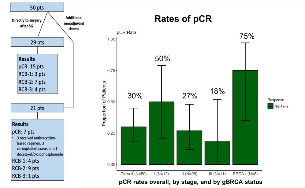 本次ASCO大会上披露了NeoSTAR研究戈沙妥珠单抗单药治疗组的结果。共计50名患者接受了戈沙妥珠单抗单药治疗,98%(n=49)的患者完成了4周期的新辅助治疗,影像学缓解率为42%(n=21/50, 95% CI:28%~57%)。29例患者接受4周期戈沙妥珠单药治疗后直接进行手术,pCR率为30% (n=15/50, 95% CI:18%~45%),其中Ⅰ期患者50%、Ⅱ期患者27%、Ⅲ期患者18%。在其余21例接受了额外新辅助治疗的患者中,7例达到pCR(3例使用蒽环方案,3例紫杉类/铂类方案,1例多西他赛/环磷酰胺方案)。在8例gBRCA突变的患者中,7例接受戈沙妥珠单抗单药治疗后直接手术,6例(75%,6/8)达到pCR