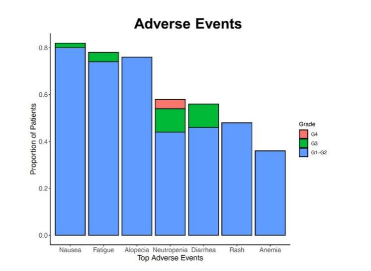 在安全性方面,戈沙妥珠单抗也表现良好。最常见的AE包括恶心(82%,n=41),乏力(78%,n=39),脱发(76%,n=38),中性粒细胞减少(58%,n=29), 贫血(36%,n=18)及皮疹(48%,n=24)。仅6%患者出现剂量减低,没有患者由于疾病进展或AE而停药,仅有一例患者因病灶缓解不理想由研究者主动停药