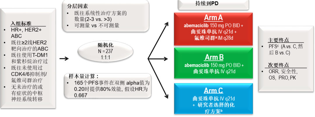 MonarcHER研究(NCT02675231)是一项随机、多中心、开放标签的Ⅱ期研究,纳入HR+/HER2+局部晚期不可手术或转移性乳腺癌患者,既往晚期阶段接受过至少二线抗HER2靶向治疗后进展,按照1:1:1随机分组接受治疗。A组:阿贝西利+曲妥珠单抗+氟维司群,B组:阿贝西利+曲妥珠单抗,C组:化疗+曲妥珠单抗治疗。主要终点为研究者评估ITT人群PFS,优先比较A组与C组,若结果为阳性,再进一步比较B组和C组,次要终点包括ORR、安全性、OS等。