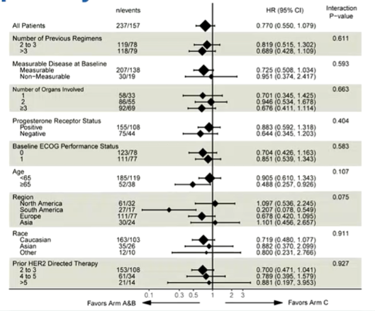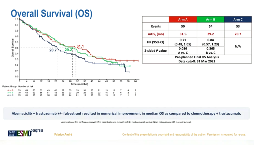 今年ESMO大会新鲜出炉了该研究OS最终分析结果。截止至2022年3月31日,237例患者共发生157例死亡事件,其中A组50例(63%),B组54例(68%),C组53例(67%)。中位随访52.9个月时,A组、B组、C组的中位OS分别为31.1个月 vs 29.2个月 vs 20.7个月(A组 vs C组:HR 0.71,95%CI:0.48~1.05,双侧norminal P=0.086;B组 vs C组:HR 0.84,95%CI:0.57~1.23,双侧norminal P=0.365)。OS采用描述性检验而非正式检验,结果显示,阿贝西利+曲妥珠单抗+氟维司群较化疗+曲妥珠单抗在数值上显著改善晚期三阳性晚期乳腺癌OS,各个亚组有一致OS获益。