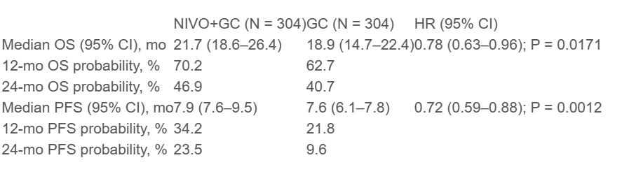LBA7-CheckMate 901:CheckMate 901研究为不可切除或转移性膀胱癌(mUC)患者带来希望。该研究评估了奈伐单抗(NIVO)与吉西他宾-卡铂(GC)与单独GC治疗mUC患者的效果。结果显示,与GC相比,NIVO+GC组患者OS显著改善,死亡风险降低22%;PFS显著改善,降低28%的进展或死亡风险;ORR更高(NIVO+GC为57.6%,GC为43.1%)。研究表明,NIVO+GC作为第一个在这种情况下改善OS的同时使用检查点抑制剂和化疗组合,代表了mUC患者的新治疗标准。