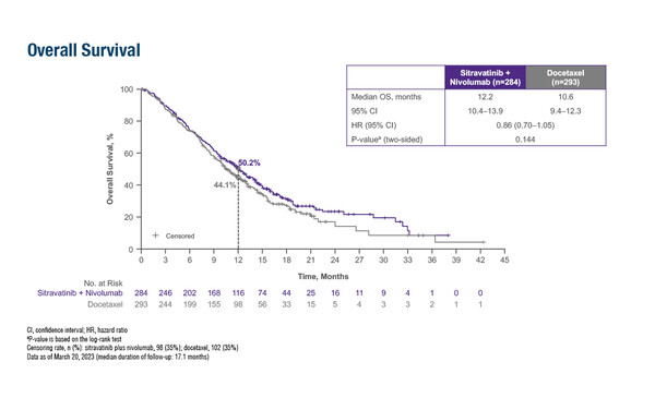 在577例患者中,司曲替尼+纳武利尤单抗组的中位OS为12.2个月,而多西他赛组为10.6个月(风险比[HR]=0.86; 95%可信区间[CI] 0.70~1.05; p=0.144)。