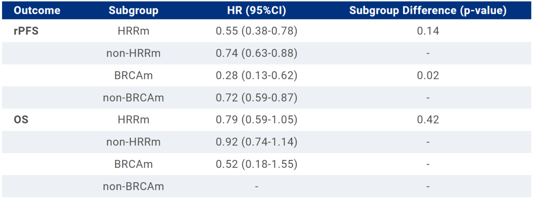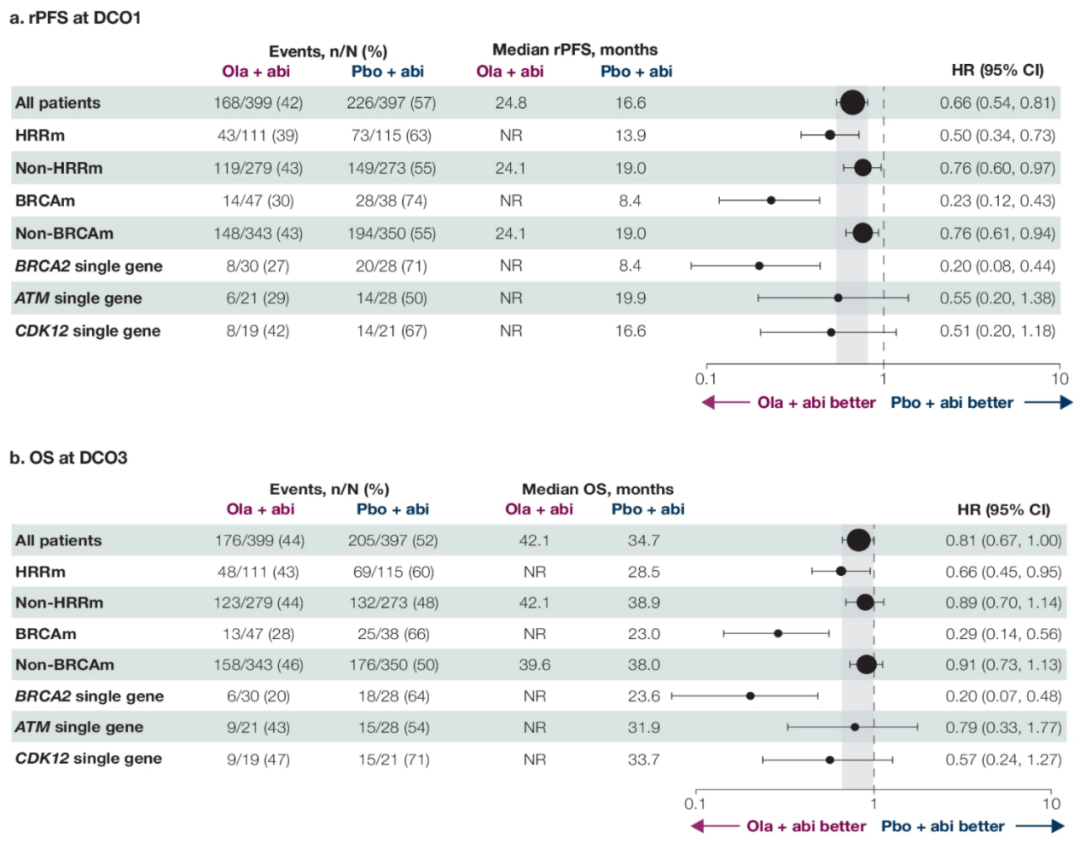 △PROpel研究全人群、非HRRm以及HRRm(包括不同HRR基因突变)患者的rPFS和OS