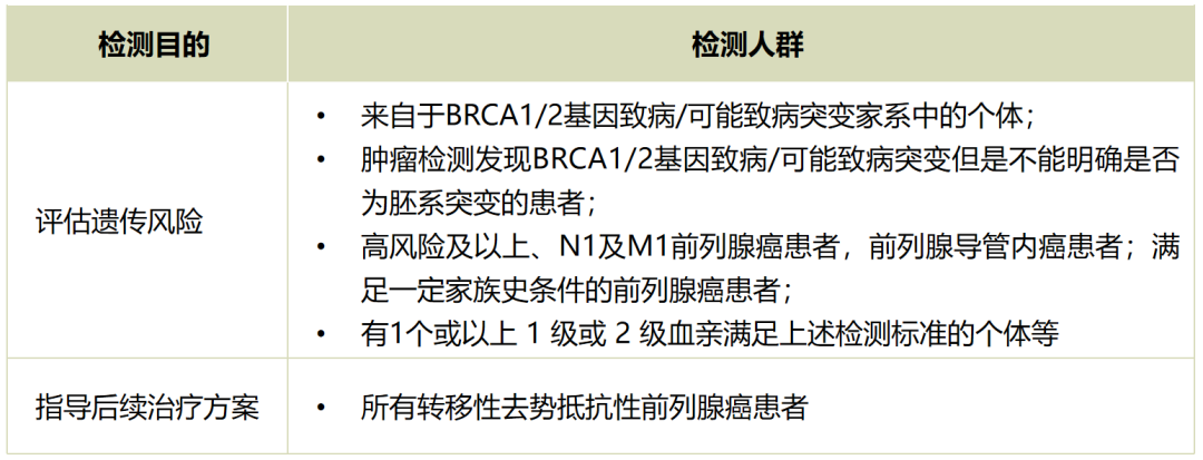 目前,晚期前列腺癌基因检测主要用于以下人群:(1)以指导后续治疗方案为目的,则推荐所有转移性去势抵抗性前列腺癌患者进行BRCAm检测。(2)以评估遗传风险为目的,则推荐:来自BRCA1/2基因致病/可能致病突变家系中的个体;肿瘤检测发现BRCA1/2基因致病/可能致病突变但是不能明确是否为胚系突变的患者;高风险及以上、N1及M1前列腺癌患者;前列腺导管内癌患者;满足一定家族史条件的前列腺癌患者;有1个或以上1级或2级血亲。